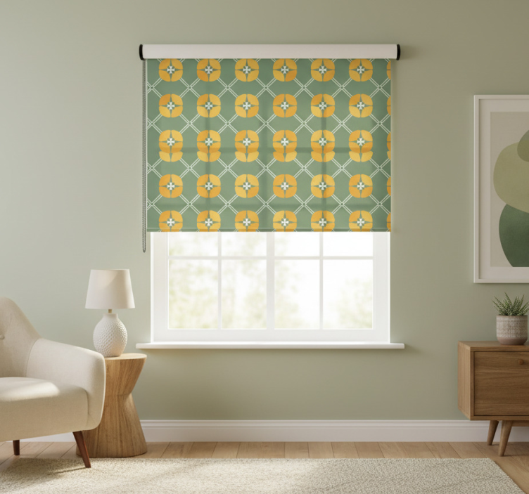 Estor enrollable verde con patrón floral vintage