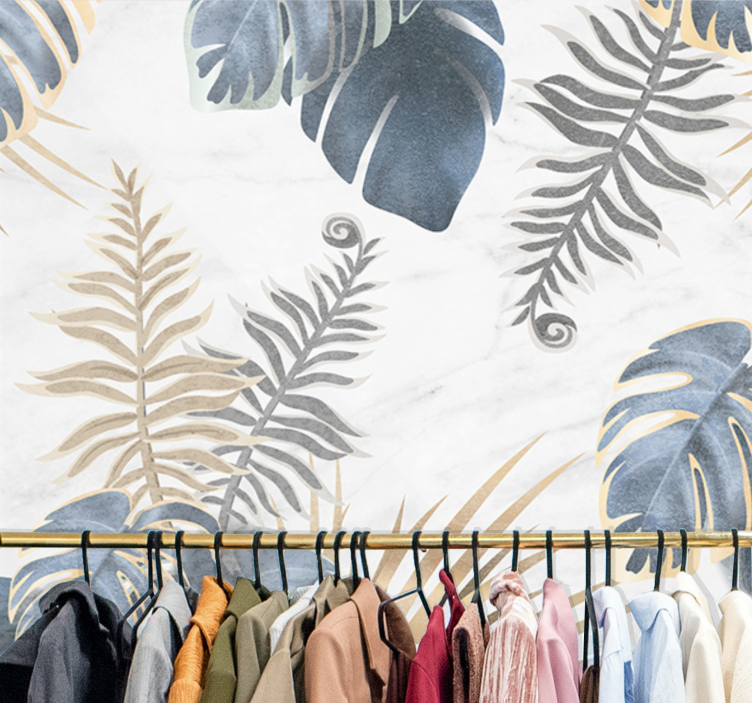 Referencia: F12220Un diseño elegante que presenta diversas hojas y follaje en una mezcla de colores. La disposición intrincada captura la esencia de la naturaleza, mostrando una combinación de hojas tropicales y helechos, creando una atmósfera refrescante y serena.