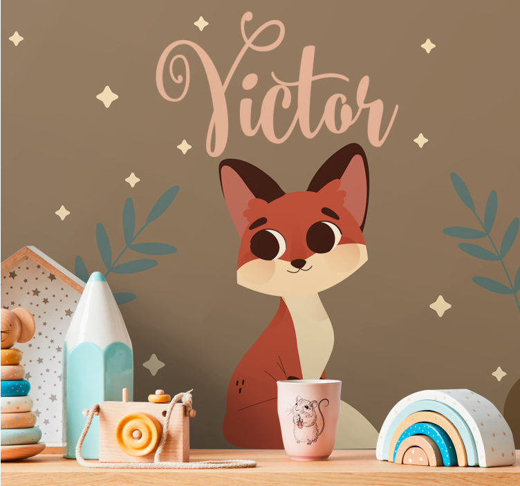 Referencia: F9831Un encantador personaje de zorro con ojos grandes y un comportamiento juguetón, rodeado de delicado follaje y estrellas. El diseño incluye el nombre 'Victor', añadiendo un toque personalizado a este delicioso motivo, perfecto para espacios infantiles o áreas lúdicas.