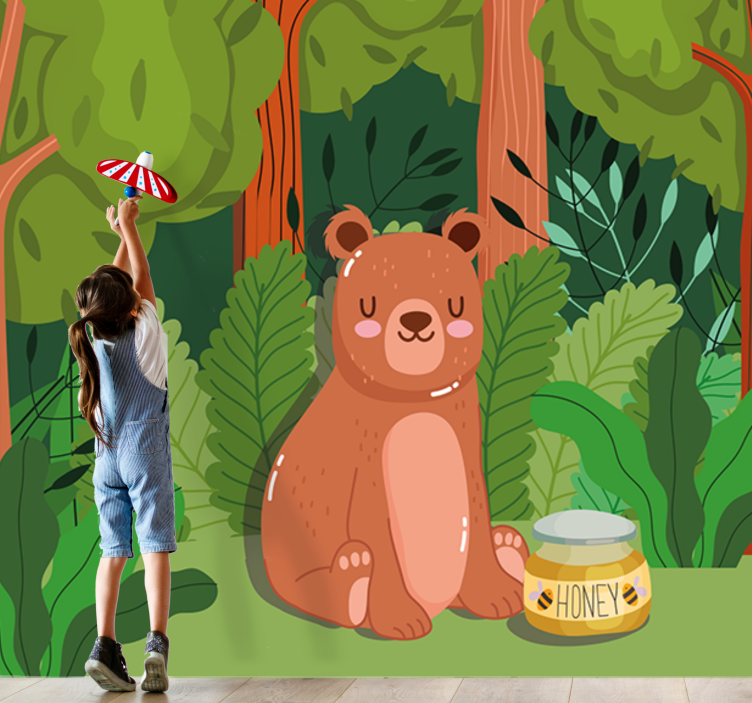 Transforma el espacio de tu pequeño con el mural de pared infantil arte de oso adorable, una encantadora ilustración que evoca la magia del bosque. Este hermoso diseño presenta un tierno oso rodeado de árboles y miel, creando un ambiente cálido y acogedor que invita a la imaginación. Los animales y la naturaleza se entrelazan en esta obra de arte, haciendo que cada rincón del cuarto sea un lugar especial para soñar y jugar.