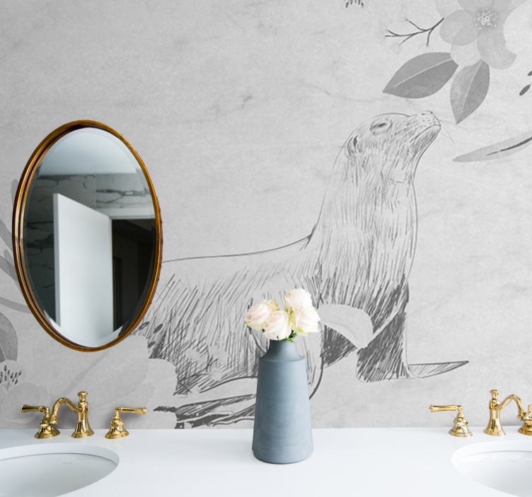 Descubre el encantador Mural para baño foca entre flores, una obra de arte que combina la dulzura de una foca con la belleza de un bosquejo de flores. Este diseño en escala de grises evoca la tranquilidad de la naturaleza y aporta un toque único a tus espacios. Con su estilo desenfadado, este mural es perfecto para dar vida a cualquier baño.
