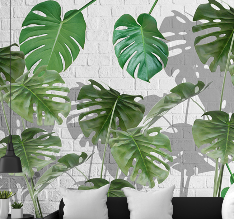 Transforma tu espacio con el papel pintado naturaleza arreglo de hojas monstera, donde el verdor exuberante se mezcla con un diseño tropical encantador. Las hojas vibrantes y el fondo de ladrillos aportan un toque fresco y acogedor a cualquier habitación, creando un ambiente ideal para relajarte y disfrutar. ¡Este diseño es perfecto para los amantes de la naturaleza!