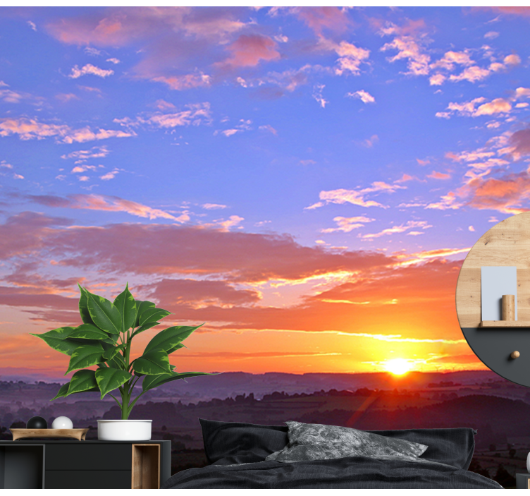 Transforma tus espacios con el papel pintado paisaje atardecer sobre colinas, un diseño que evoca la tranquilidad de un atardecer en la naturaleza. Con un cielo resplandeciente, nubes suaves y montañas que se extienden hasta el horizonte, este paisaje captura la esencia de la serenidad y la belleza natural. Ideal para quienes buscan un toque artístico y relajante en su hogar, este fotomural te transportará a un mundo de calma y armonía.