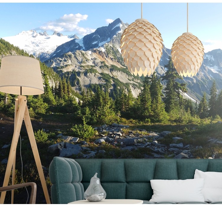 Transforma tu espacio con el papel pintado paisaje vista del bosque montañoso, donde majestuosas montañas cubiertas de nieve se entrelazan con frondosos árboles y un paisaje natural que evoca la calma del bosque. Este diseño cautivador invita a la serenidad y a la conexión con la naturaleza, creando un ambiente acogedor y relajante en cualquier habitación.