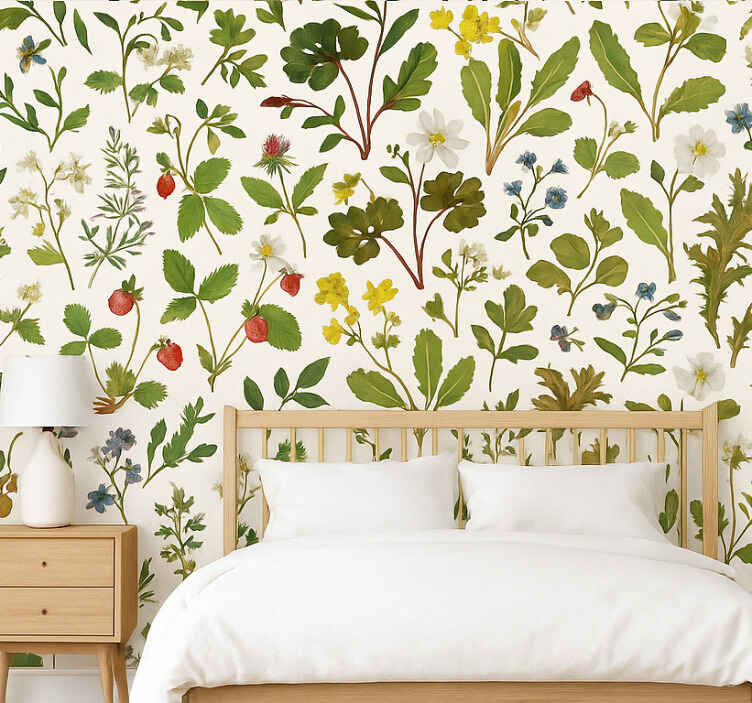 Papel pintado dormitorio matrimonio diseño botánico fondo blanco