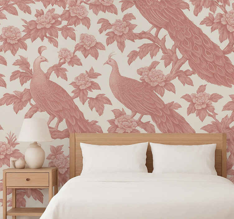Papel pintado dormitorio matrimonio patrón de pavos rosas