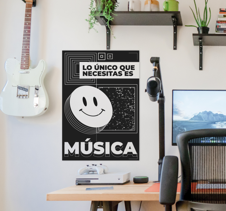 Poster con texto lo único que necesitas es música. El diseño esta compuesto por un fondo negro y un smile en color blanco con efecto movimiento y el texto en blanco y negro. Si usted es un amante de la música o de oír esta para relajarse mientras estudia, trabaja o realiza sus proyectos este poster para pared de habitación es lo que estaba buscando para decorar su lugar de relax.
