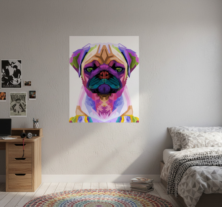 Incorporar este poster para salón perro pug en pop art en tu hogar no solo añade un toque de alegría, sino que también refleja tu personalidad y amor por los animales. Es una forma única de expresar tu estilo y de hacer que tus invitados se sientan bienvenidos. Este diseño impactante atraerá todas las miradas y será un excelente punto de conversación. ¡Dale vida a tus paredes con esta obra de arte que no pasará desapercibida!