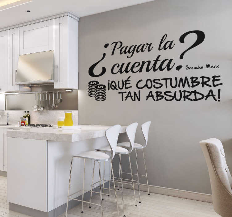 Vinilo decorativo de una frase del conocido humorista Groucho Marx en la que puedes encontrar ¿Pagar la cuenta? ¡Qué costumbre tan absurda!.