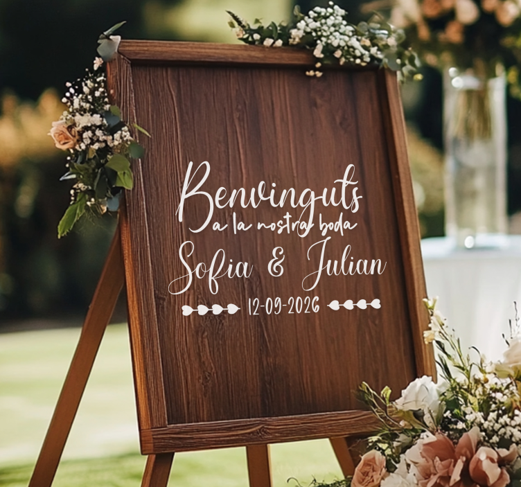 Referencia: A41634¡Bienvenidos a la celebración de su amor! La Pegatina boda tablón de madera personalizado (catalán) es la elección perfecta para añadir un toque único y especial a tu evento. Este diseño encantador presenta un fondo que evoca la calidez de la madera, y en él resaltan las palabras 'Bienvenidos' y 'Boda', creando un ambiente acogedor y festivo que refleja el tema de tu boda de manera personalizada.