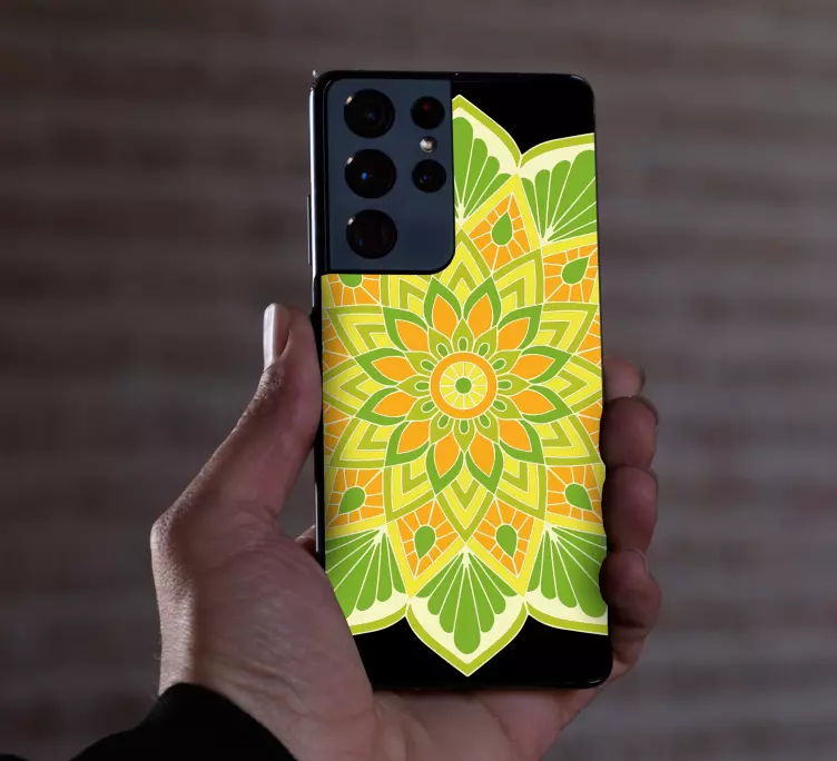 Transforma tu móvil Samsung con nuestra pegatina samsung elemento mandala floral. Este encantador diseño gráfico presenta intrincados mandalas en vibrantes tonos de verde, amarillo y naranja, creando un hermoso patrón que evoca la naturaleza. Con su estampado único, este adhesivo no solo embellece tu teléfono inteligente, sino que también lo protege con estilo.