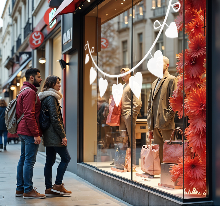 Referencia: A40830¡Celebra el amor con nuestra Pegatina San Valentín corazones de semicírculo! Este encantador diseño presenta corazones colgando que transformarán el frente de tu tienda o escaparate en un espacio lleno de romance y alegría. Perfecta para San Valentín, esta pegatina hará que los enamorados se sientan aún más especiales al contemplar tu decoración festiva.