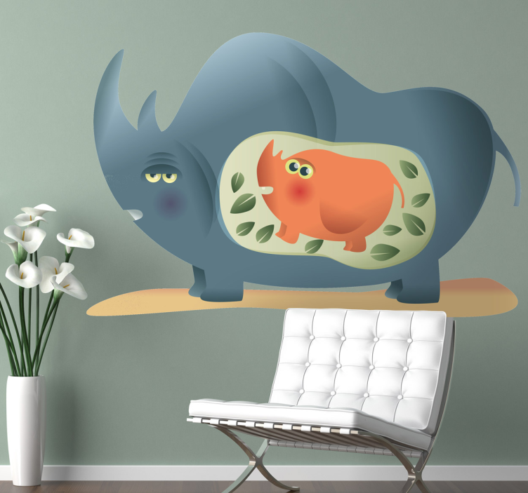 Descubre la maravilla de nuestro vinilo animal salvaje ilustración de animales juguetones, donde un adorable rinoceronte y su bebé dan vida a un diseño caprichoso y vistoso. Este encantador gráfico, que muestra a una mamá rinoceronte embarazada rodeada de hojas en un estilo de dibujos animados, añade un toque juguetón y vibrante a cualquier espacio. ¡Perfecto para alegrar la habitación de los más pequeños o cualquier rincón de tu hogar!