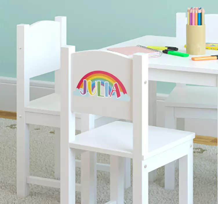 Este vinilo nombre para silla con arco iris se puede personalizar sin ningún tipo de problema. Por un lado, puedes indicar el nombre que desees, el cual aparecerá con los mismos colores del arco iris y, por otro lado, puedes escoger las medidas que mejor se adapten a tus necesidades.