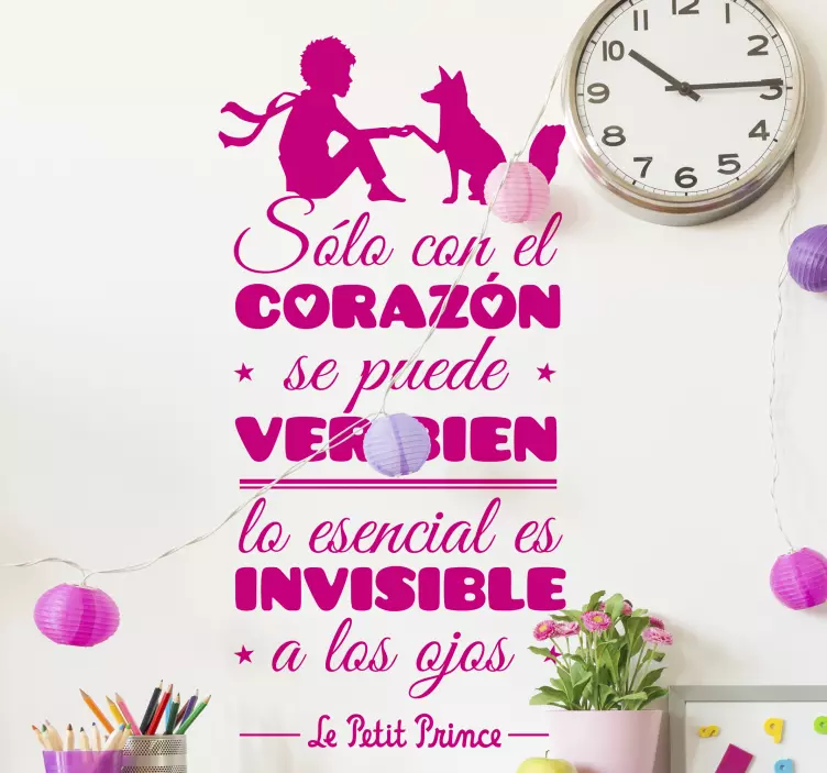 Referencia: A10731En este sticker aparece la silueta del protagonista de tu cuento favorito junto a a un zorro y debajo el texto "Sólo con el corazón se puede ver bien, lo esencial es invisible a los ojos". Un bonito texto filosófico y motivador para renovar la estética de tu hogar. Vinilos baratos y de gran calidad, disponibles en gran variedad de colores y tamaños.