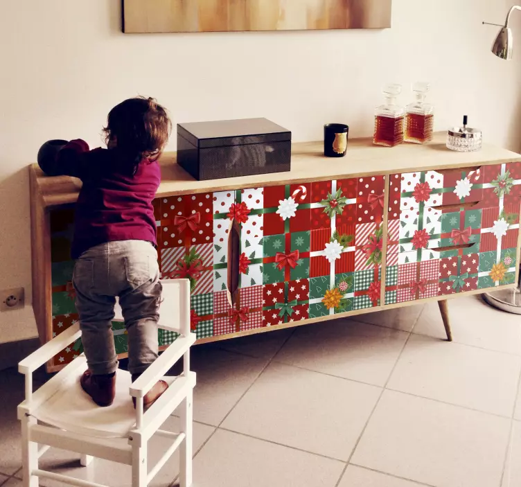 Descubre el encantador vinilo embalaje de regalo celebratorio, un diseño que transforma cualquier mueble en un auténtico festival navideño. Con su patrón de cuadrícula en rojo y verde, adornado con lazos decorativos, evoca la calidez de la Navidad y el espíritu festivo. ¡Perfecto para envolver regalos y dar un toque especial a tus muebles!