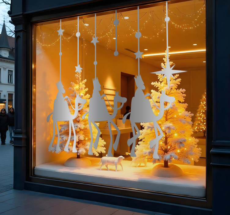 Vinilo escaparate tres reyes colgados