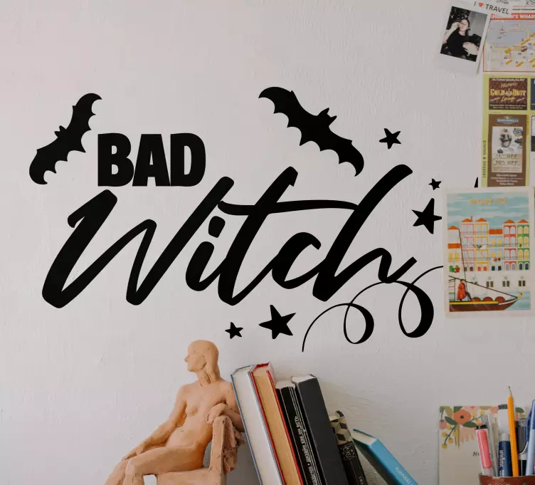Referencia: A51376Un diseño llamativo que presenta la frase 'Bad Witch' adornada con murciélagos y estrellas juguetonas. Perfecto para añadir un toque caprichoso a tu decoración de Halloween, esta pieza captura el espíritu de la temporada con una estética audaz y monocromática.