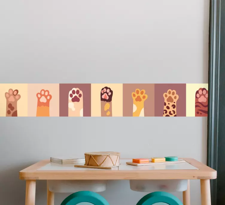 Descubre el encanto de nuestro Vinilo huellas alegres de patas, un diseño que combina la alegría de los dibujos animados con la calidez de los azulejos decorativos. Este vistoso patrón de patas de animales y mascotas añade un toque divertido a cualquier espacio, con una cenefa que enmarca cada detalle y una frontera que realza su atractivo. Ideal para los amantes de los gatos y las mascotas, este estampado transformará tu hogar en un lugar lleno de vida y color.