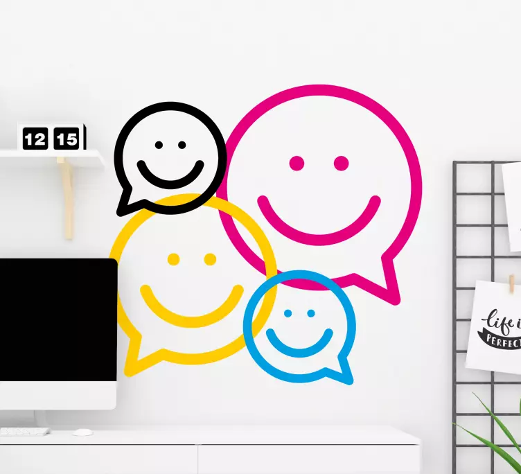Descubre nuestro Vinilo iconos de caritas sonrientes, un diseño vibrante y lleno de alegría que presenta burbujas de diálogo y caras sonrientes. Estos emoticonos, vistosos y alegres, transforman cualquier espacio, aportando un toque de felicidad y comunicación al ambiente. Ideal para aquellos que buscan dar un aire fresco y divertido a sus interiores, estos dibujos animados son perfectos para habitaciones, oficinas o cualquier rincón que necesite un poco de optimismo.
