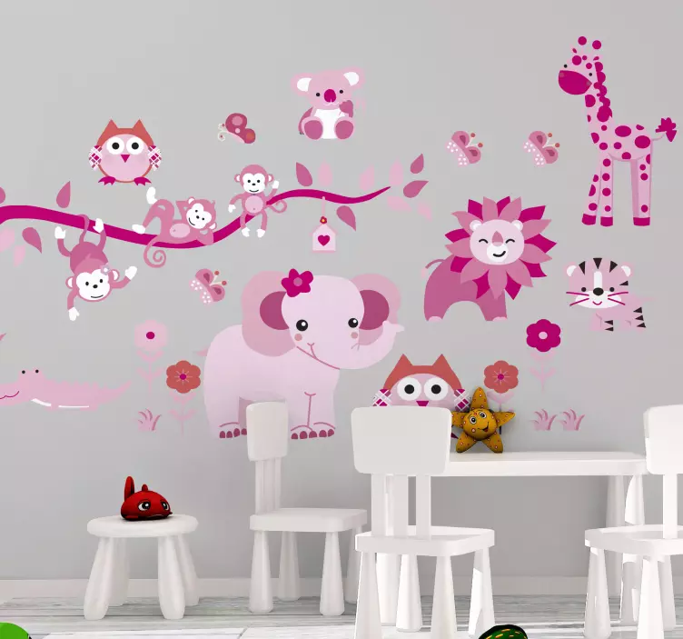¡Descubre el Vinilo infantil compilación de criaturas adorables! Este diseño gráfico es un festín para los ojos, lleno de tonos rosa y rosado, que presenta animales de la selva y la jungla en un estilo de dibujo animado que captura la esencia de lo salvaje. Con su aspecto decorativo y vistoso, esta ilustración juguetona y caprichosa es perfecta para transformar cualquier habitación infantil en un espacio mágico y divertido.