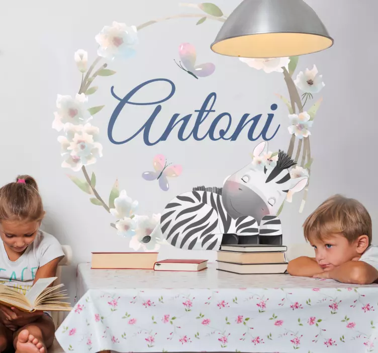 Descubre la magia del Vinilo infantil diseño floral de cebra, un producto encantador que transformará cualquier espacio en un rincón lleno de alegría. Este diseño personalizable incluye un lindo nombre en caligrafía envolvente, rodeado de una caprichosa guirnalda de flores y una adorable cebra, creando un ambiente juguetón ideal para los más pequeños. Perfecto para estimular la imaginación de los niños, este vinilo es un elemento imprescindible en la decoración infantil.