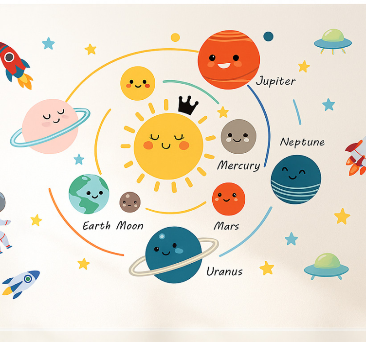 El vinilo infantil mural del planeta para niños no solo transforma cualquier espacio, sino que también inspira la curiosidad y el amor por el universo. Cada rincón decorado con este vinilo invita a los niños a explorar, aprender y soñar en grande. Su diseño alegre y colorido crea un ambiente acogedor y estimulante, perfecto para la creatividad infantil. ¡Ideal para hacer de cualquier habitación un lugar especial y lleno de aventuras!