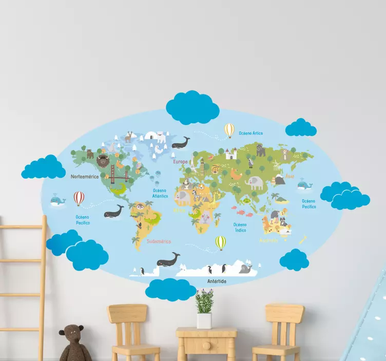 Magnífico vinilo mapamundi infantil con los nombres de los continentes y animales característicos de cada zona geográfica para que los más pequeños aprendan nuevos animales y los puedan situar en el mapa. El Diseño está colocado encima de un fondo azul que simula el agua y el cielo, rodeado de nubes y globos aerostáticos. Un bonito diseño de mapamundi animales y fauna para decorar la habitación de los más pequeños del hogar. Crea un ambiente especial, bonito y confortable en el que poder pasar tantas horas como desees. Un producto de fácil colocación para que no queden burbujas en el interior. Este adhesivo mapamundi infantil de animales dejará a todos asombrados.