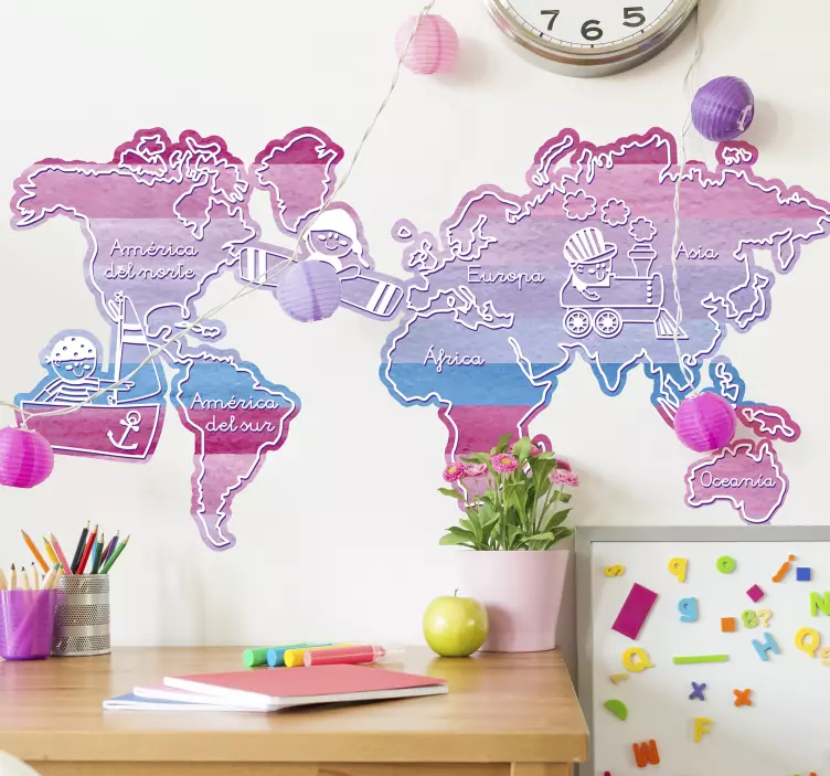 Descubre el asombroso vinilo mapa mundial aventura, una obra de arte que transforma cualquier espacio en un rincón lleno de color y conocimiento. Con un diseño en acuarela que presenta el mundo en un contorno juguetón, este vinilo es perfecto para el cuarto de los niños, aportando un toque vistoso y educativo que fomenta el interés por la geografía. ¡Deja que la aventura comience en las paredes de tu hogar!