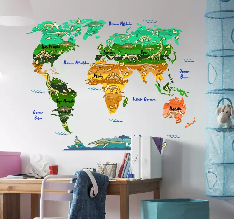 Fantástico vinilo adhesivo personalizable ideal para decorar una habitación infantil o el aula de una escuela. El siguiente vinilo decorativo para pared está formado por el diseño de un mapa del mundo en tonos naranjas y verdes. Este vinilo para la casa incluye además el nombre de los continentes y océanos en vaso y, la ilustración de varios esqueletos de dinosaurios colocados en la zona dónde habitaron hace muchos siglos atrás. Esta pegatina para pared cumple una función decorativa pero también lúdica, ya que puede servir como soporte explicativo en una clase de historia. Personaliza este vinilo de animal con las medidas que mejor se adapten a tus necesidades y haz tu pedido. Colócalo siguiendo las instrucciones de montaje.