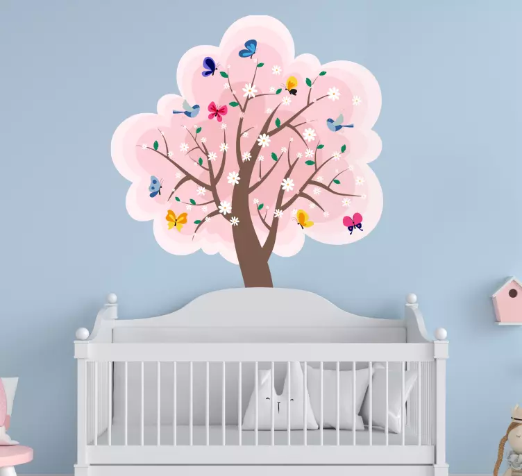 Descubre la belleza de la Vinilo naturaleza escena de Árbol en flor, una ilustración que captura la esencia de la naturaleza en su máximo esplendor. Este diseño presenta un árbol en flor rodeado de mariposas coloridas, creando un ambiente vistoso que evoca la primavera. Los tonos rosados y rosa se entrelazan, llenando cualquier espacio de alegría y frescura.