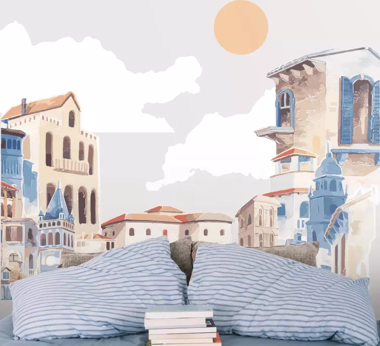 Descubre nuestro Vinilo paisaje urbano encantador, una hermosa representación de un pueblo lleno de vida, donde los edificios se entrelazan con la arquitectura única de una ciudad vibrante. Este cuadro, pintado en acuarela, destaca por su espectacular paisaje urbano, iluminado por un sol radiante y adornado con tonos cálidos y azules que evocan una sensación de tranquilidad y felicidad.