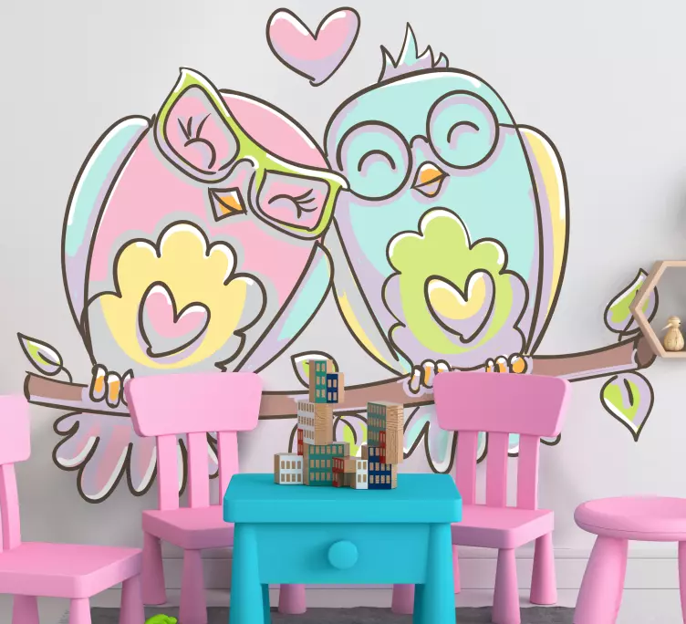 Descubre la encantadora ilustración de nuestro vinilo pájaro adorables pájaros de amor, donde una feliz pareja de búhos se entrelaza en un hermoso abrazo. Con tonos suaves de rosa y azul, este diseño no solo es lindo, sino que también irradia amor y alegría, convirtiendo cualquier espacio en un refugio acogedor y romántico.