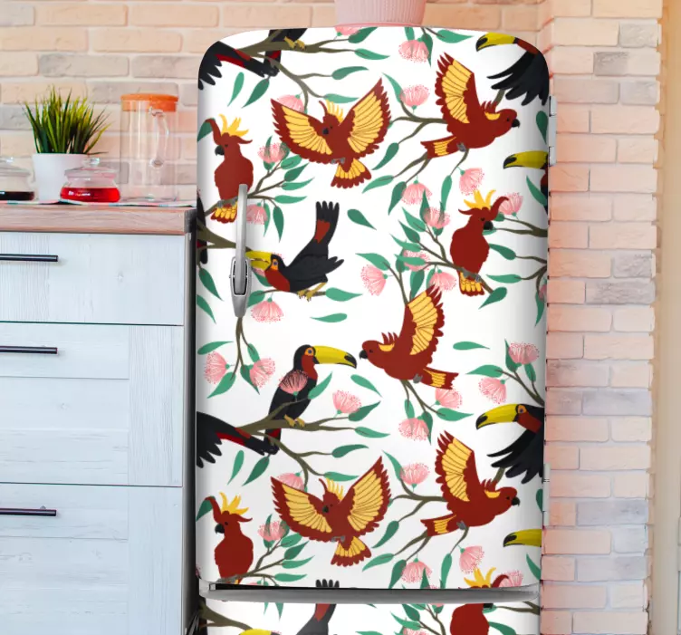 Transforma tu espacio con el Vinilo pájaro motivos de aves tropicales, un diseño gráfico que captura la esencia vibrante de la naturaleza. Con un patrón caprichoso de loros y tucanes, este vinilo es perfecto para adornar tu refrigerador, nevera o frigorífico. Su estampado floral y vistoso aportará un aire tropical a tu hogar, llenándolo de alegría y color.