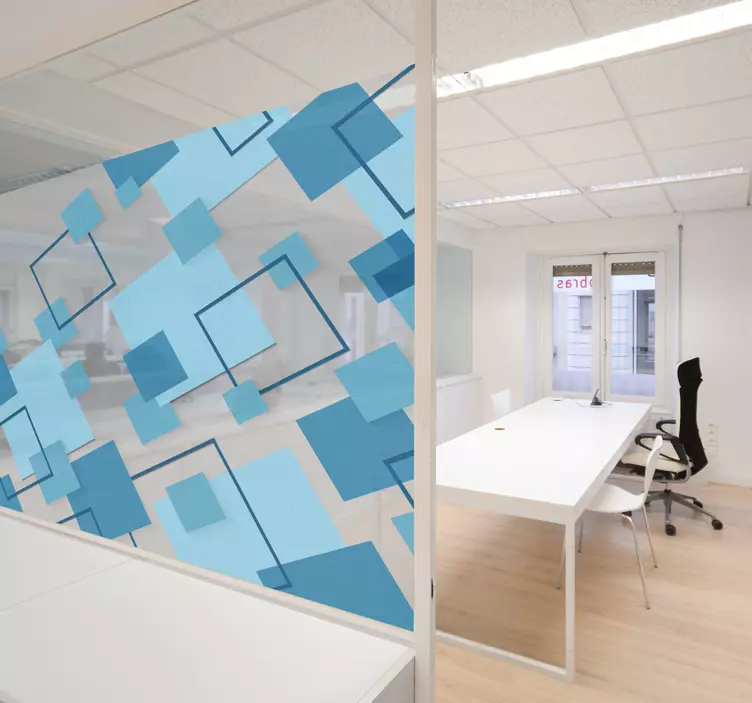 Vinilo para cristales translúcidos patrón cuadrado colores. Atractivo vinilo translucido para cristaleras con la representación de patrones geométricos cuadrados en tonos azulados muy utilizados en la decoración y personalización de superficies de vidrio o plástico translúcido.