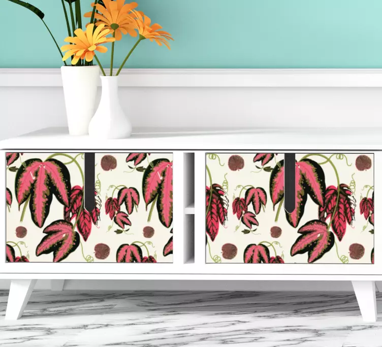 Transforma tu espacio con nuestro vinilo para mueble diseño de hojas, una obra de arte que presenta un patrón botánico de hojas de maranta. Con un estampado vibrante y vistoso, este mueble decorativo evoca la esencia tropical y natural, convirtiendo cualquier ambiente en un rincón único y acogedor. La ilustración que adorna este vinilo es perfecta para quienes buscan un toque de frescura y originalidad en su hogar.