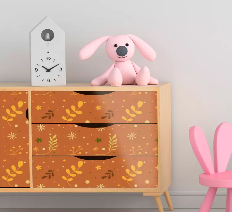 Descubre la belleza de la naturaleza en tu hogar con nuestro Vinilo para mueble patrón floral compromiso. Este encantador diseño presenta un patrón juguetón que fusiona la leña menuda y hojas en tonos cálidos, creando una atmósfera acogedora y vibrante. Perfecto para transformar cualquier mueble en una pieza única que irradia frescura y armonía con el entorno natural.