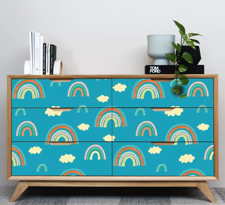 Transforma tus muebles con nuestro Vinilo para mueble patrones arcoíris coloridos, un diseño que evoca la alegría de un arcoíris brillante y juguetón. Con divertidas nubes y un patrón caprichoso, este vinilo no solo es vistoso, sino que también aporta un toque de frescura y originalidad a cualquier habitación. ¡Haz que tus muebles sean el centro de atención con este estampado lleno de vida!