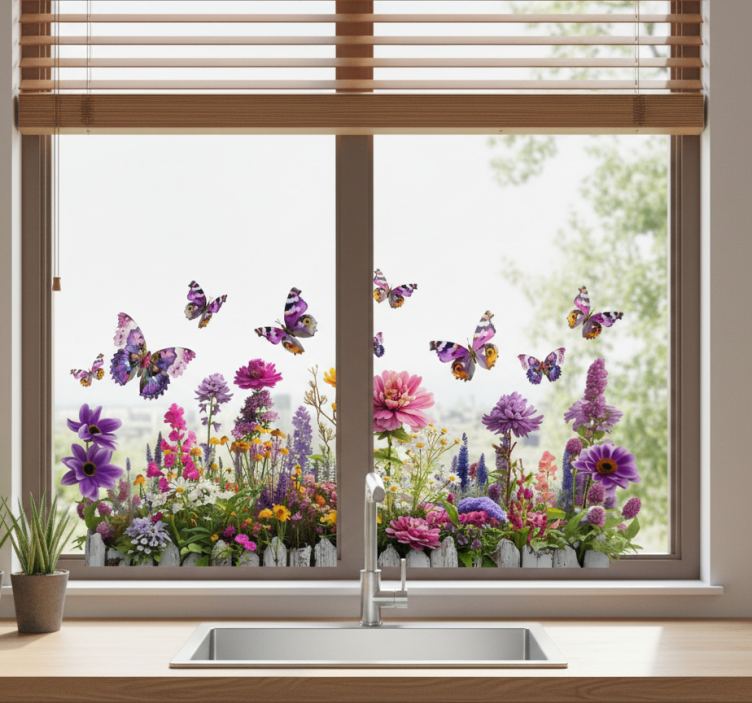 Vinilo para ventana jardín de flores mariposas