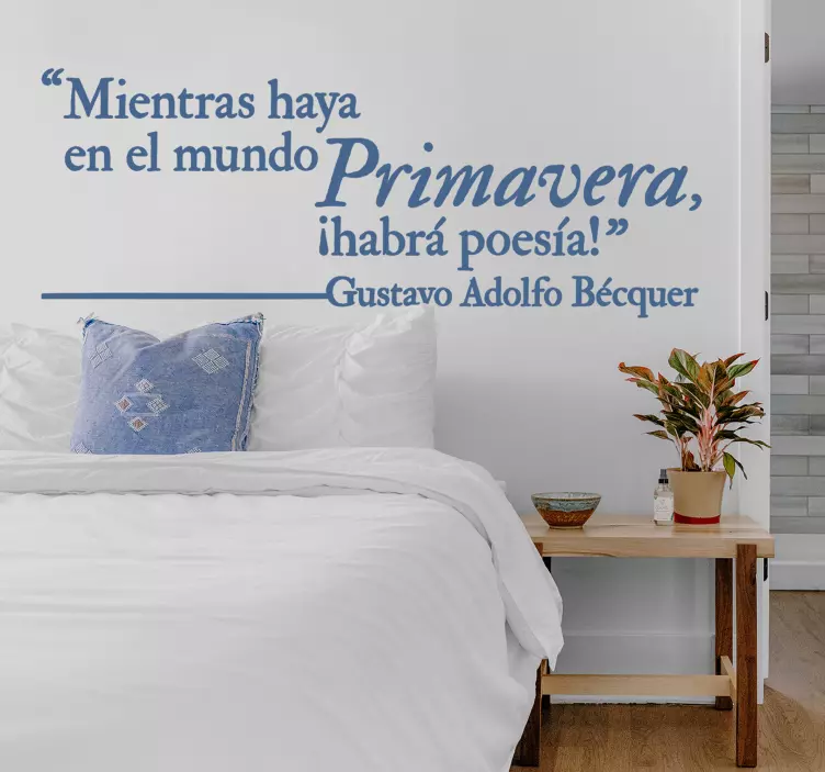 Este diseño de texto presenta la famosa cita de primavera de Gustavo Adolfo Bécquer. Disponible en una amplia gama de colores, puede elegir el tamaño adecuado para su espacio de entre las opciones proporcionadas en el campo. Fácil de mantener, se puede quitar en cualquier momento sin problemas. Este vinilo decorativo está hecho de material de alta calidad con prueba de efecto burbuja y arruga, asegurando una instalación sin problemas. Pida en línea ahora para recibir su vinilo decorativo en perfectas condiciones. Use una espátula para instalarlo correctamente en la superficie deseada.