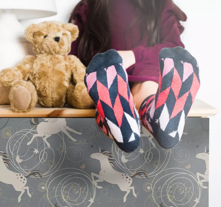 Transforma el ambiente de cualquier habitación con nuestro Vinilo para mueble patrón de unicornio encantador. Este diseño caprichoso presenta adorables unicornios, Pegasos y otras criaturas míticas en un vibrante patrón que evoca la fantasía y la magia. Con un fondo gris que resalta los remolinos, este estampado es perfecto para los niños que sueñan con mundos mágicos y aventuras increíbles. ¡Es una forma única de darle vida a tus muebles y crear un espacio encantador!
