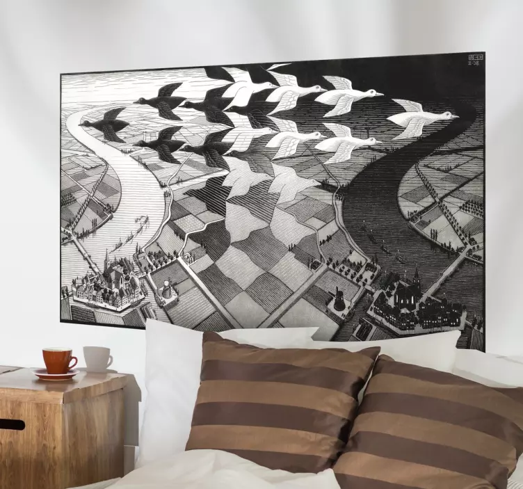 Referencia: A8730Reproducción en vinilo fotomural de una ilustración del genial artista holandés Maurits Cornelis Escher, muy reconocido por su genuina obra donde se experimenta con diversos métodos de representar espacios paradójicos que desafían a las leyes de la física y hacen trabajar la mente.