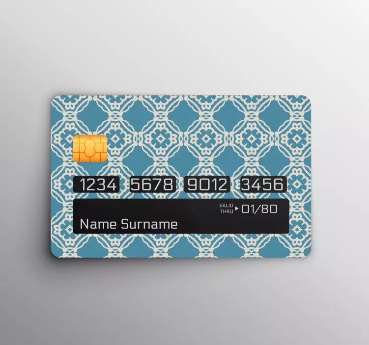 Descubre la elegancia del vinilo tarjeta de crédito con diseño estampado. Este adhesivo presenta un diseño gráfico que fusiona elementos antiguos con patrones geométricos inspirados en azulejos, todo en tonos azules. Su textura ornamental añade un toque único a tu tarjeta de crédito, haciendo que se destaque en cualquier ocasión. Personaliza tu estilo financiero y transforma tu tarjeta en una obra de arte.